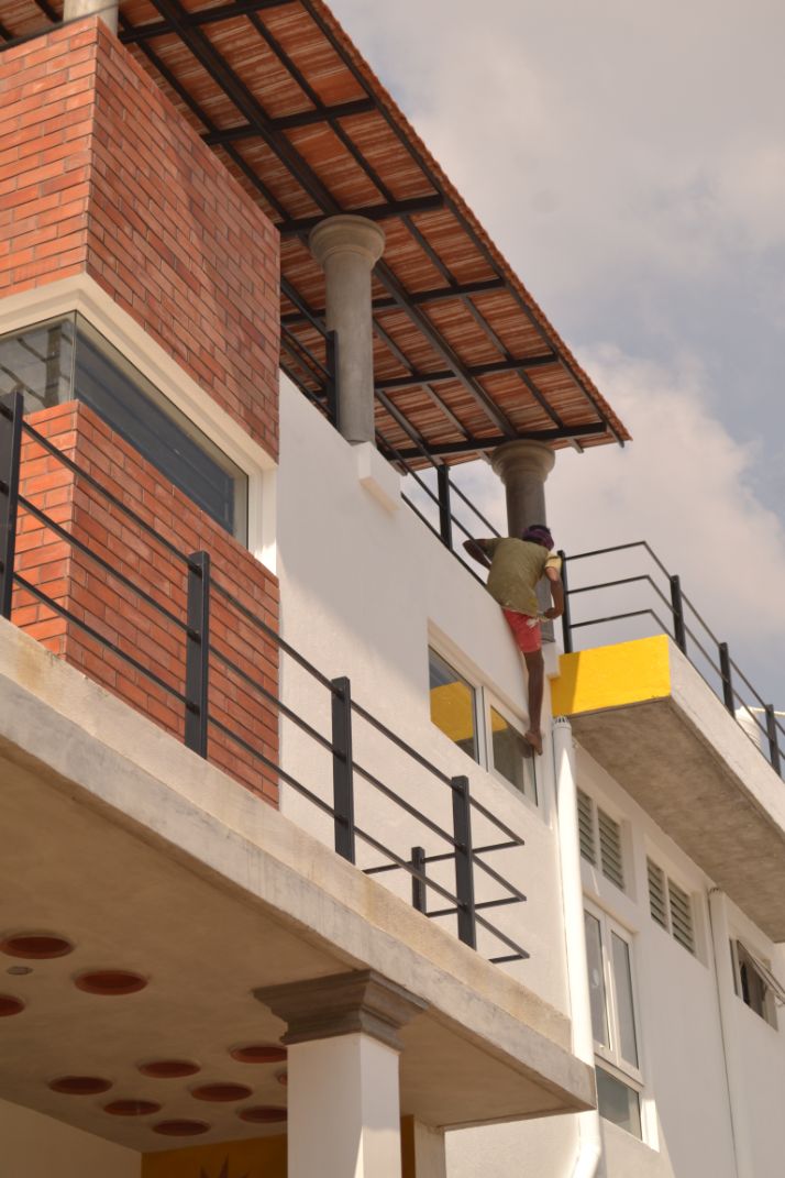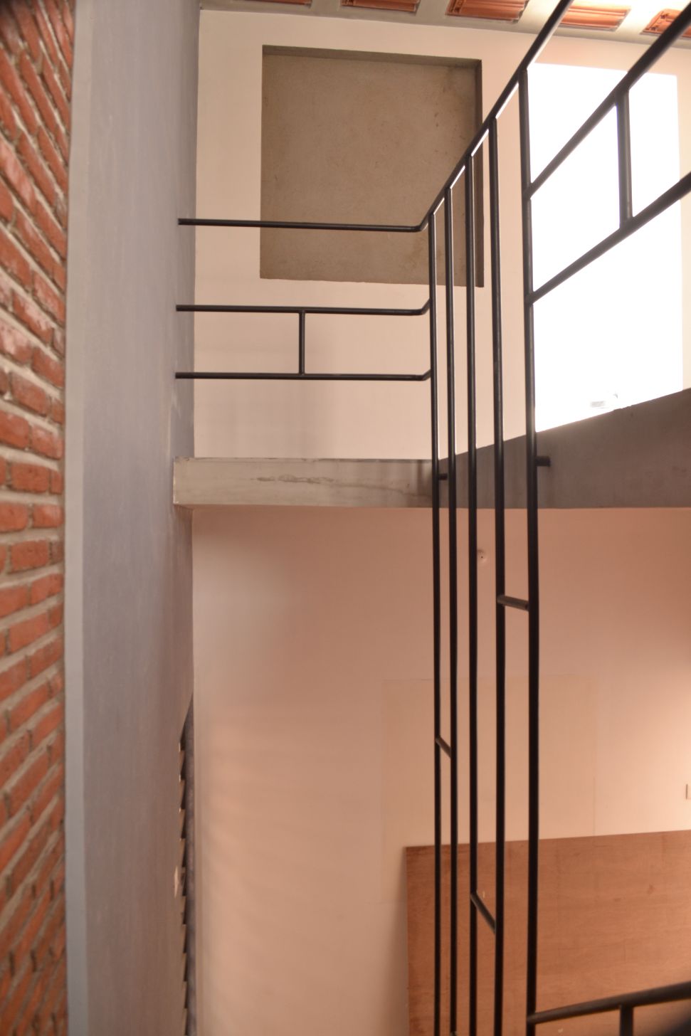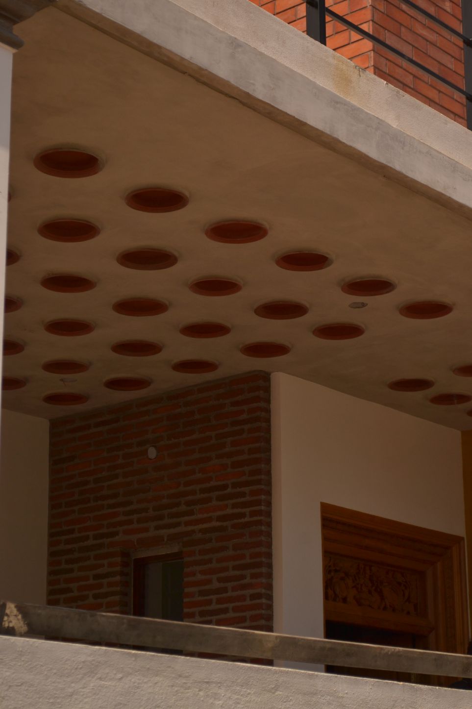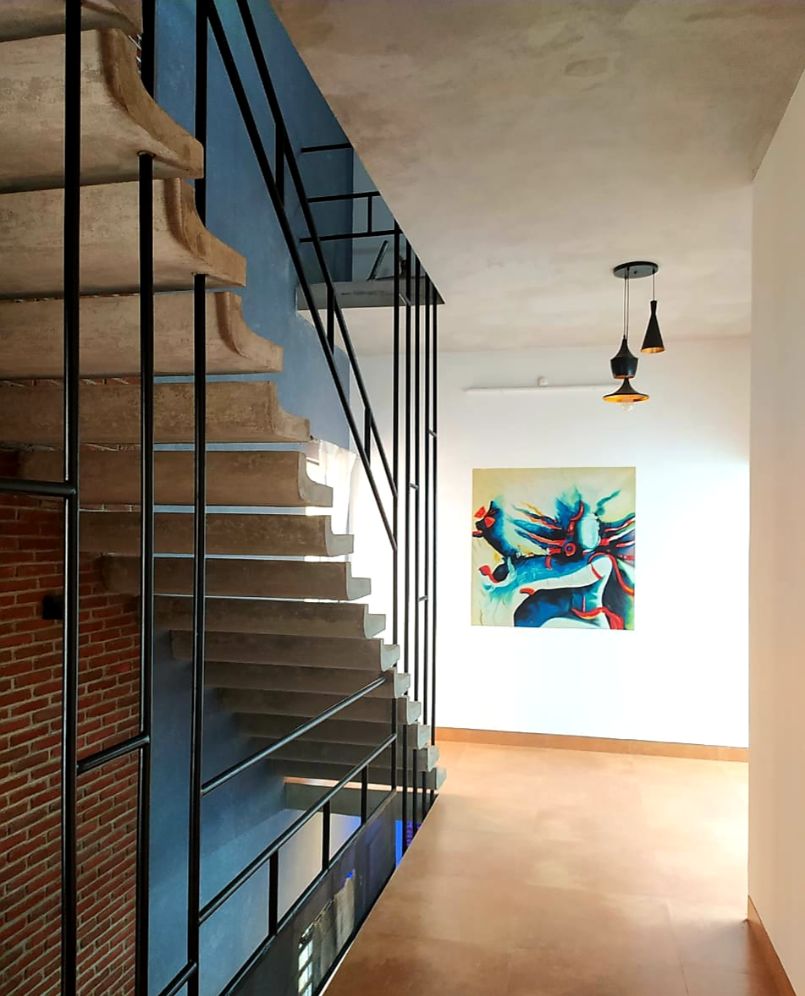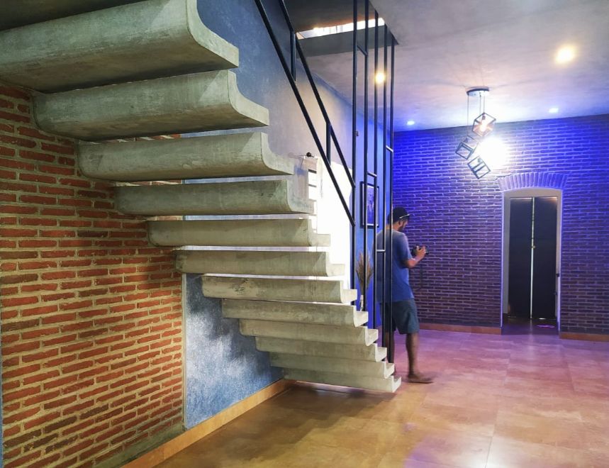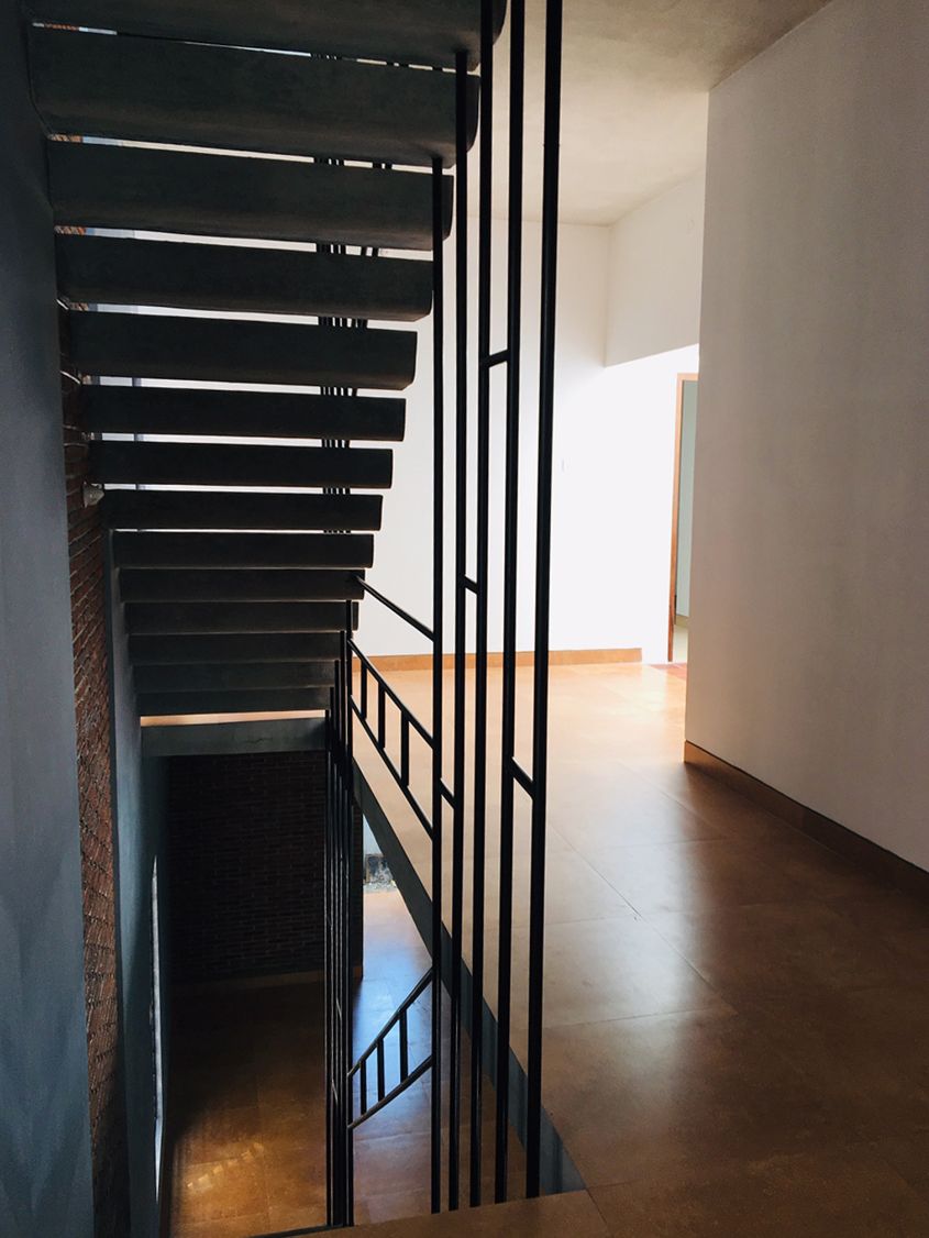 roofs, thin pre-cast cantilevered staircase and exposed un-plastered ceilings.