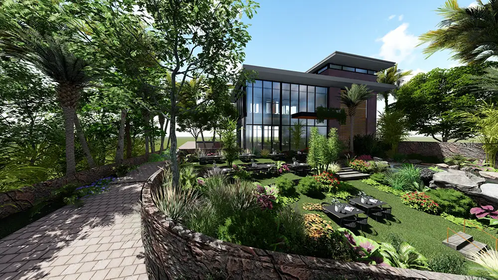 Integrating a restaurant into a larger master plan that includes a community of getaway home clusters, all