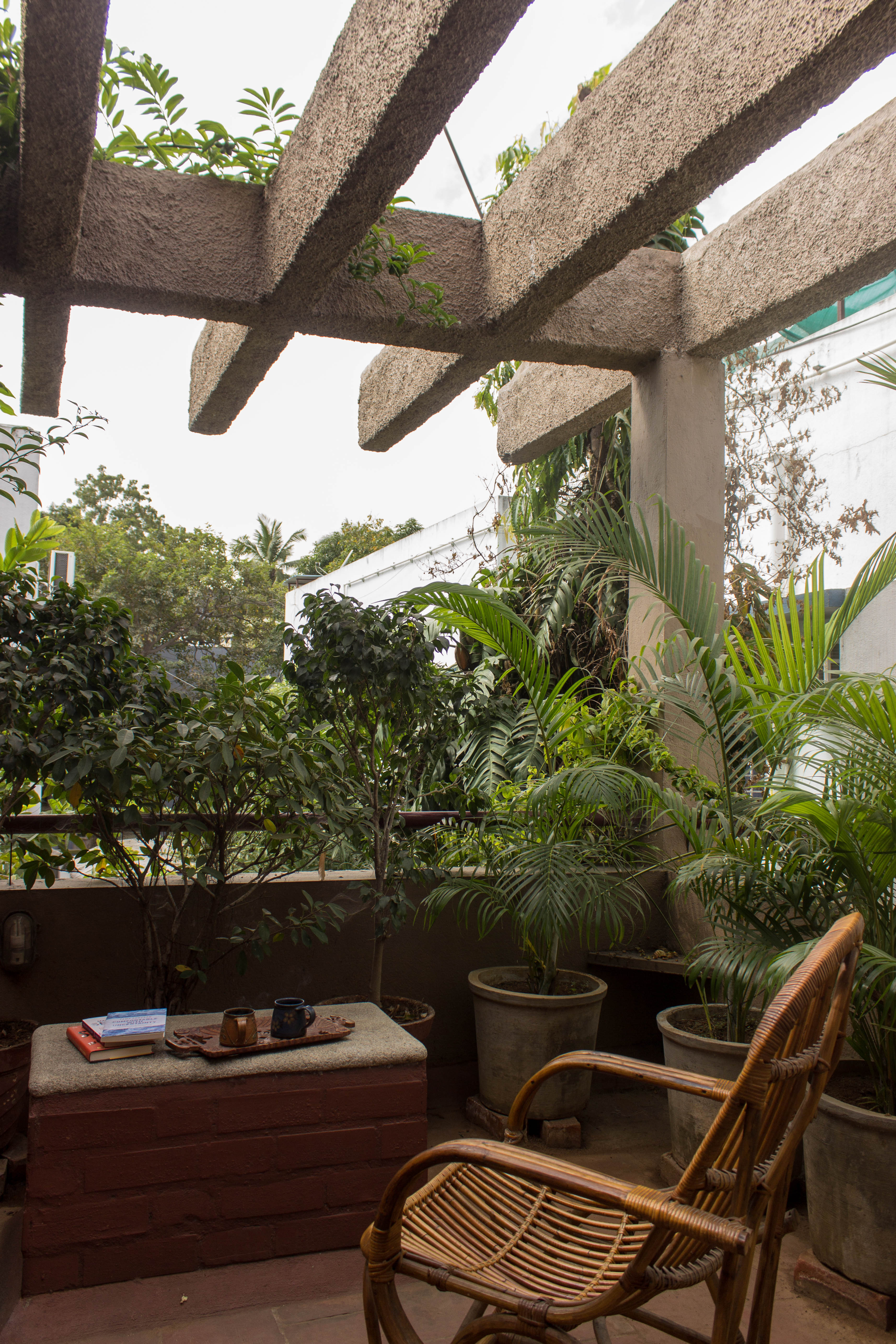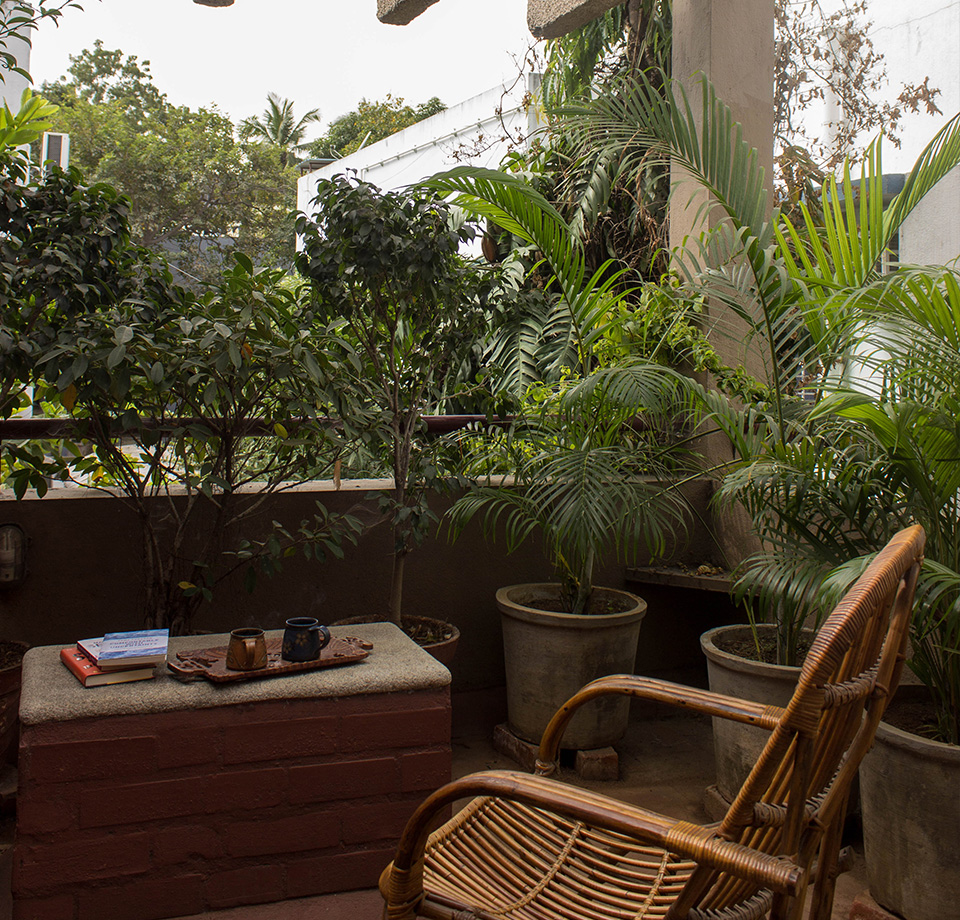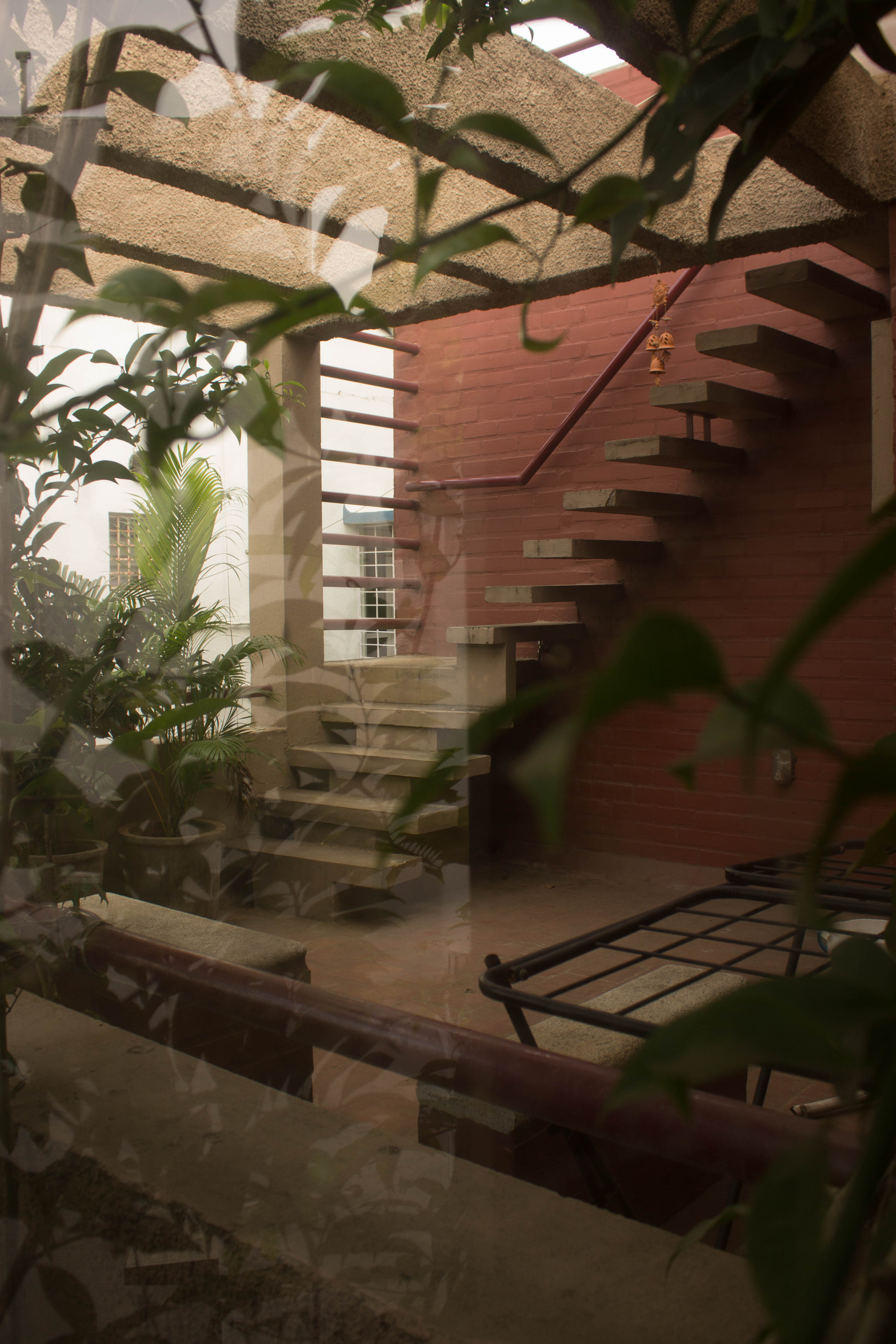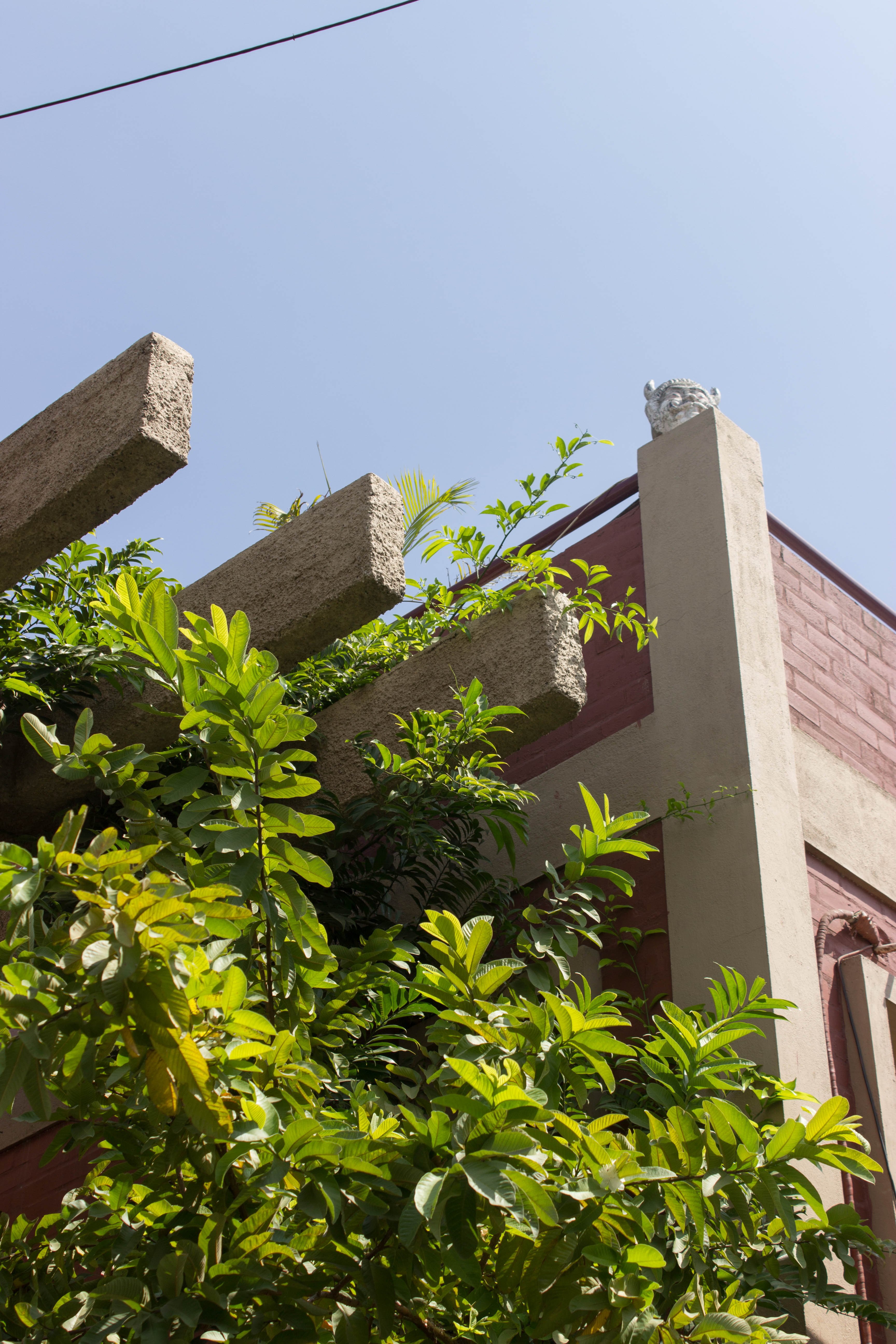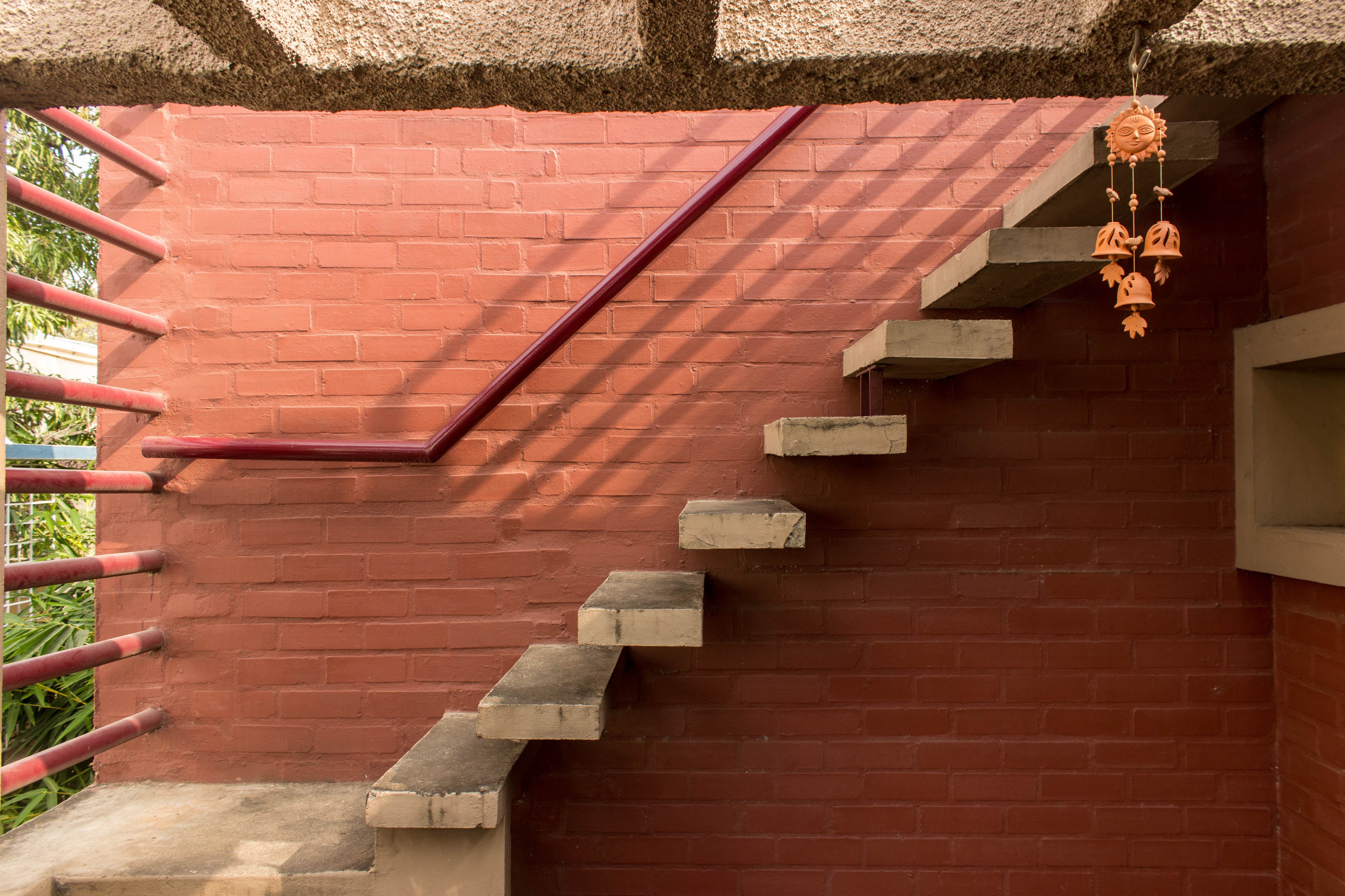 The ground floor plan is an open plan with the drawing, living, dining and kitchen spaces flowing one into the other while the first floor is equipped with three bedrooms. A double height ceiling encompasses half the ground and first floor areas to achieve a dramatic scale, accommodate a staircase and allow plenty of natural light. Hollow terracotta fired bricks have been used for all peripheral walls to achieve better thermal conductivity to maintain ambient temperatures inside the house. A 200 Sq.Ft semi open terrace on the first floor with pergolas doubles up as a terrace garden & as a play area for the dogs!