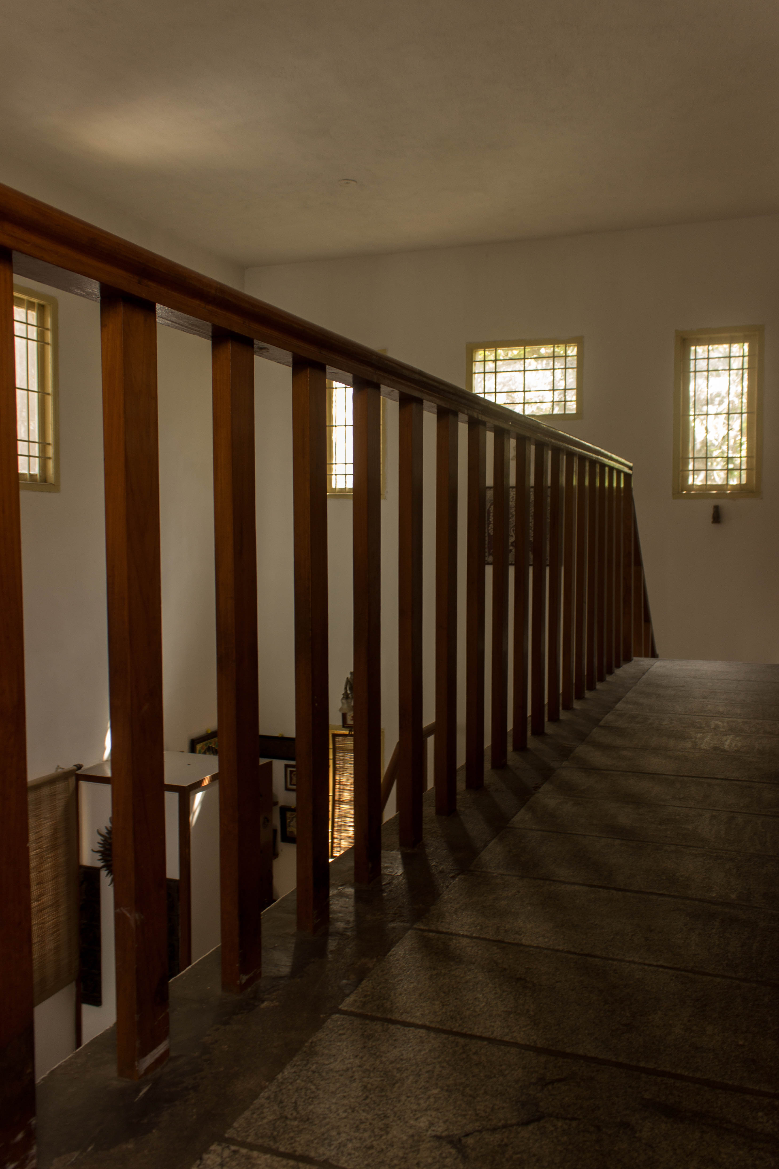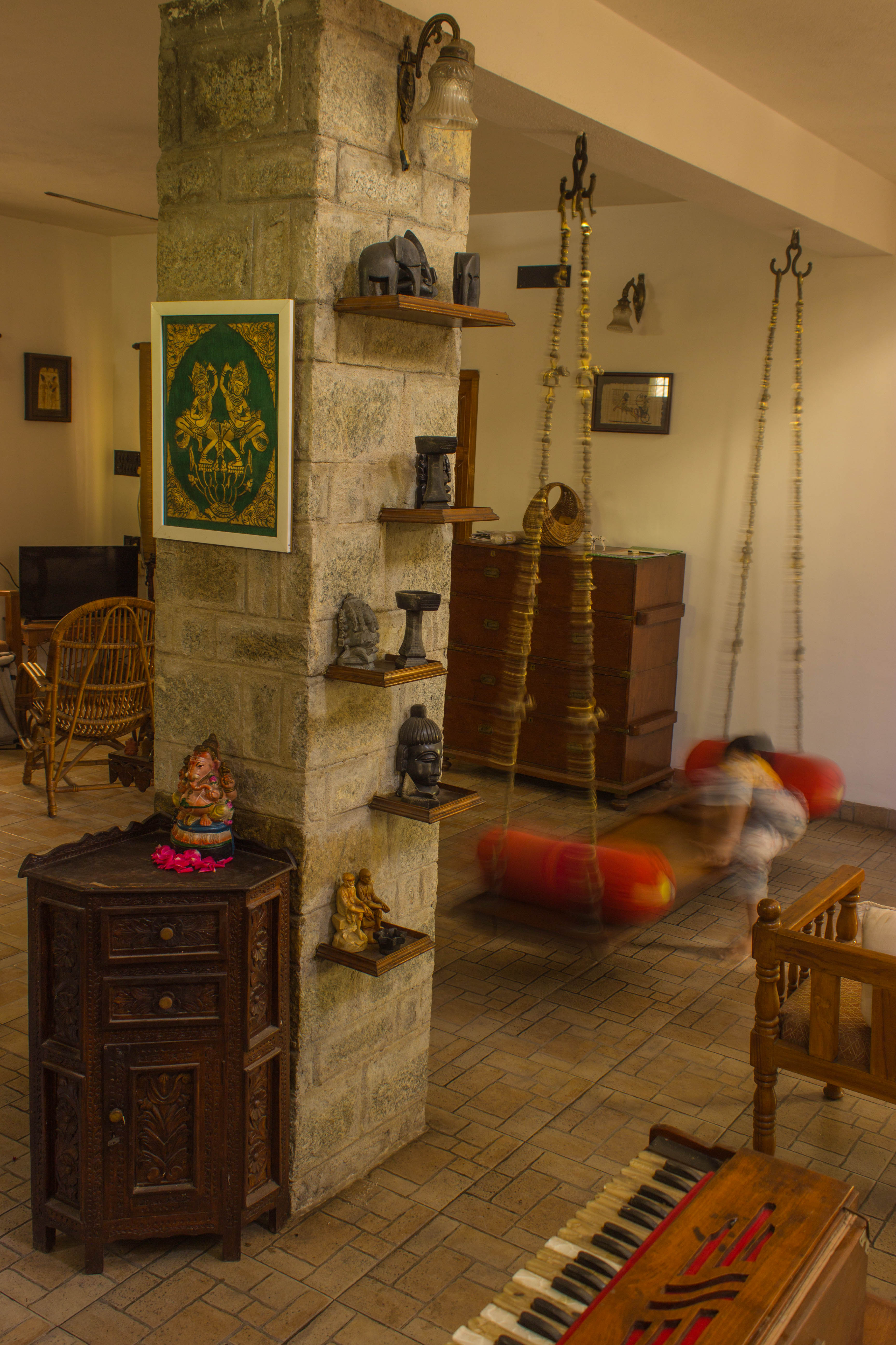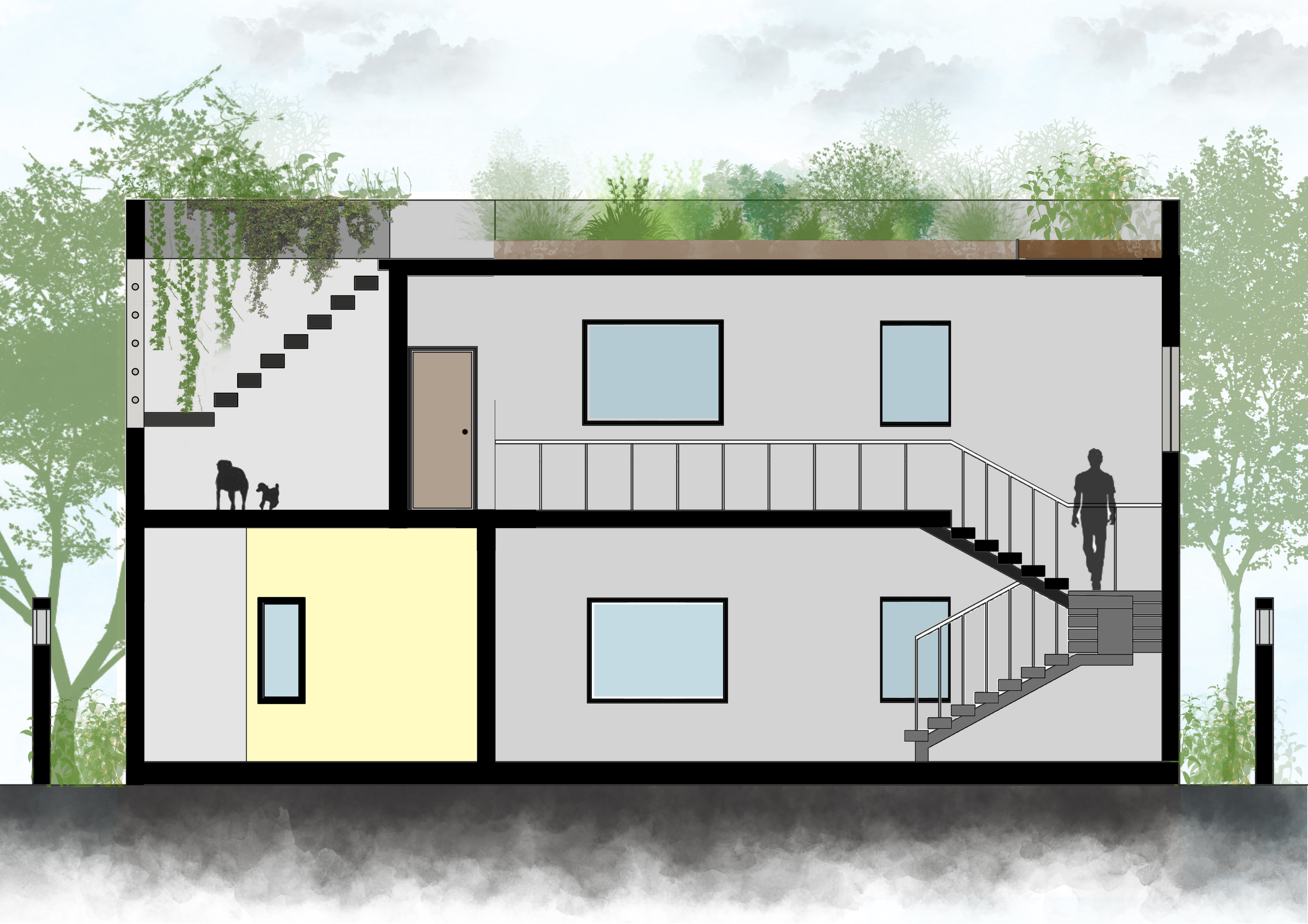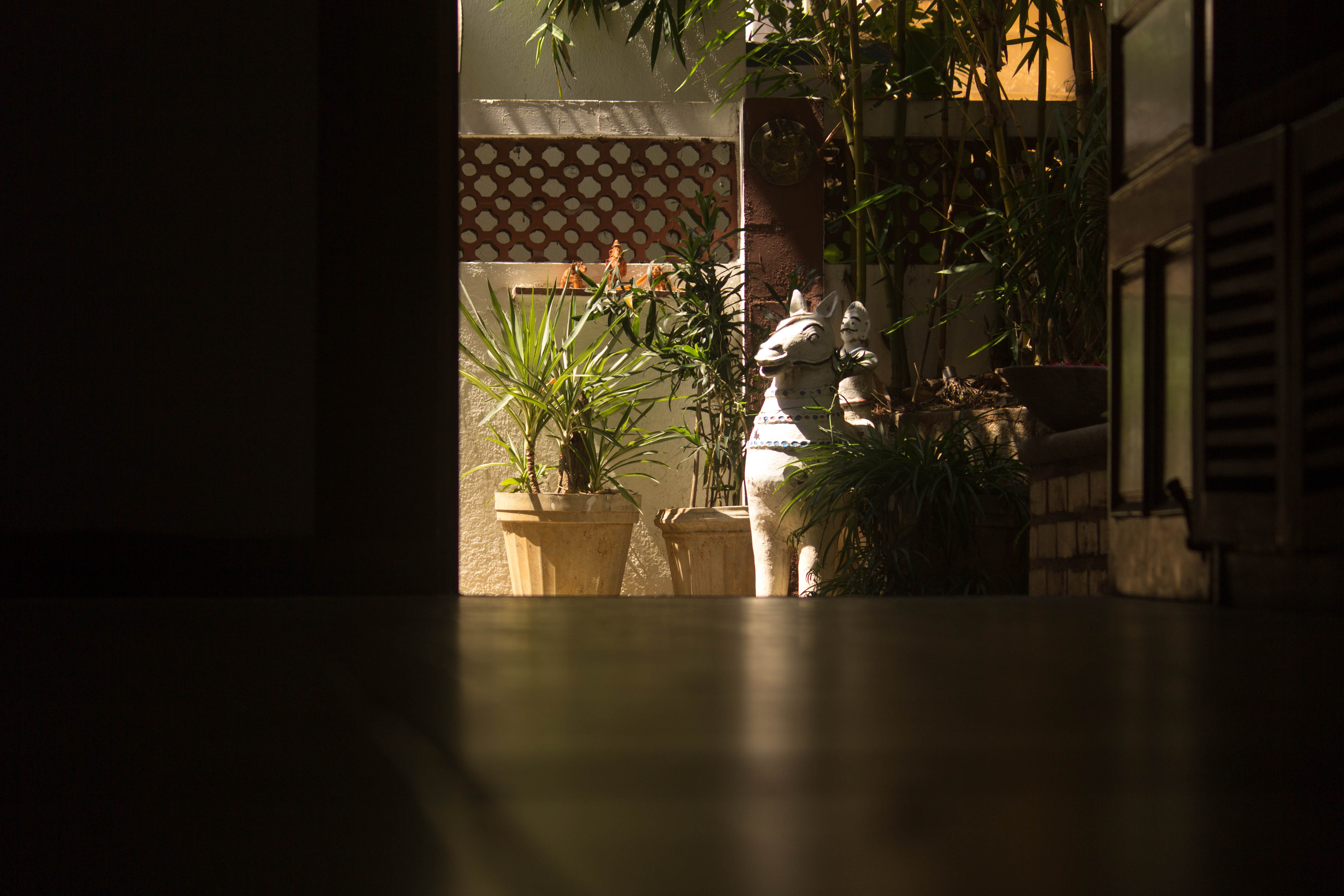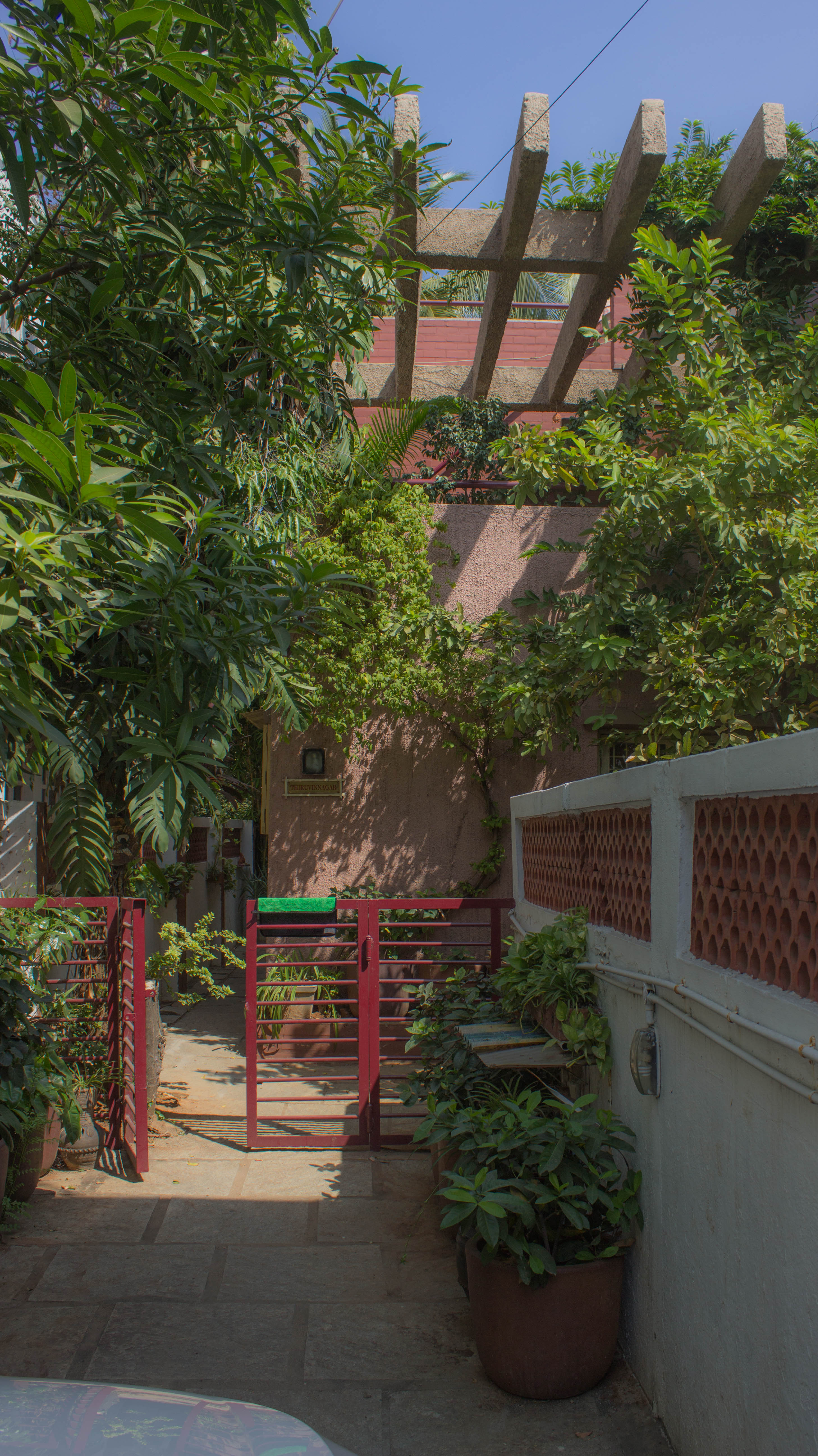 The ground floor plan is an open plan with the drawing, living, dining and kitchen spaces flowing one into the other while the first floor is equipped with three bedrooms. A double height ceiling encompasses half the ground and first floor areas to achieve a dramatic scale, accommodate a staircase and allow plenty of natural light. Hollow terracotta fired bricks have been used for all peripheral walls to achieve better thermal conductivity to maintain ambient temperatures inside the house. A 200 Sq.Ft semi open terrace on the first floor with pergolas doubles up as a terrace garden & as a play area for the dogs!