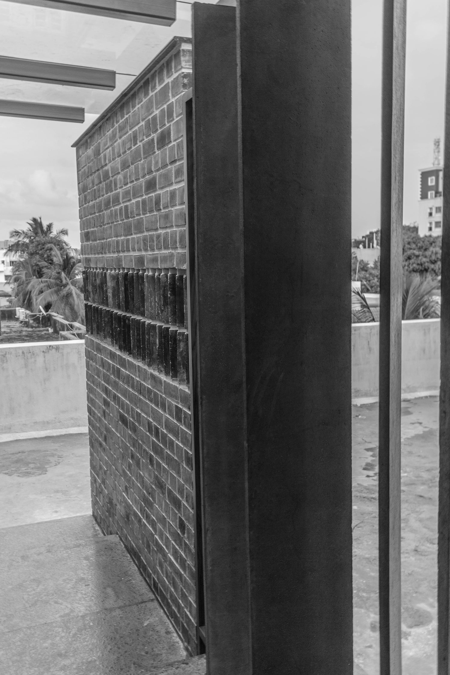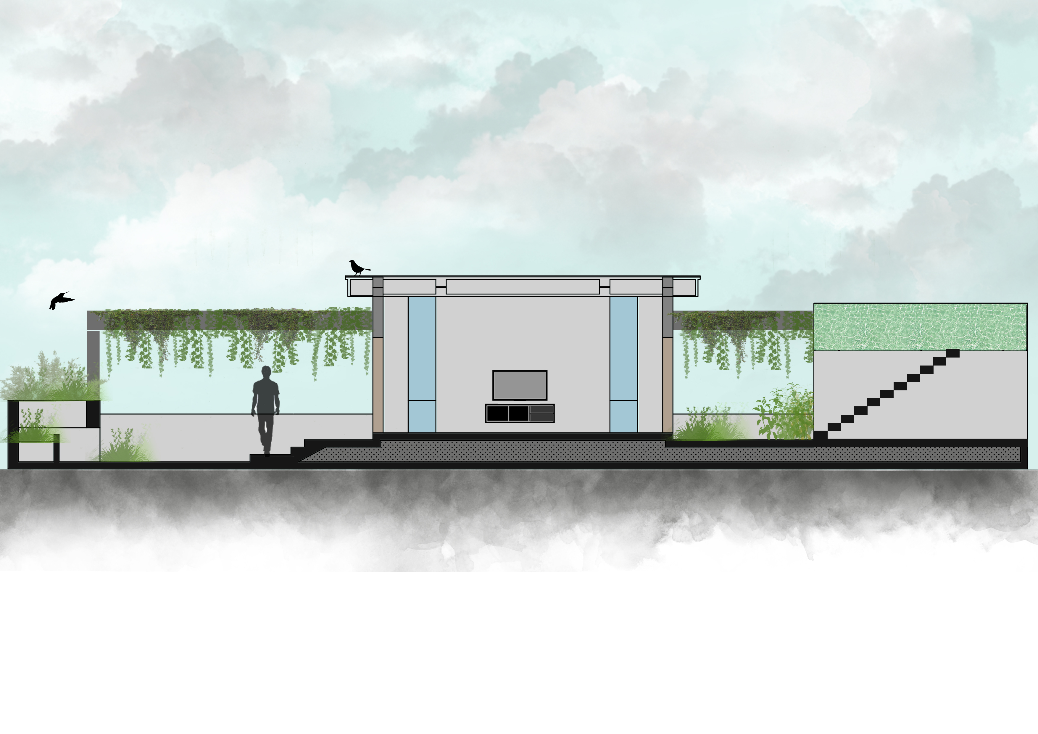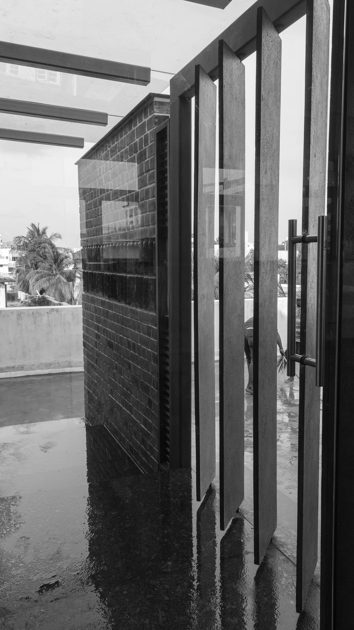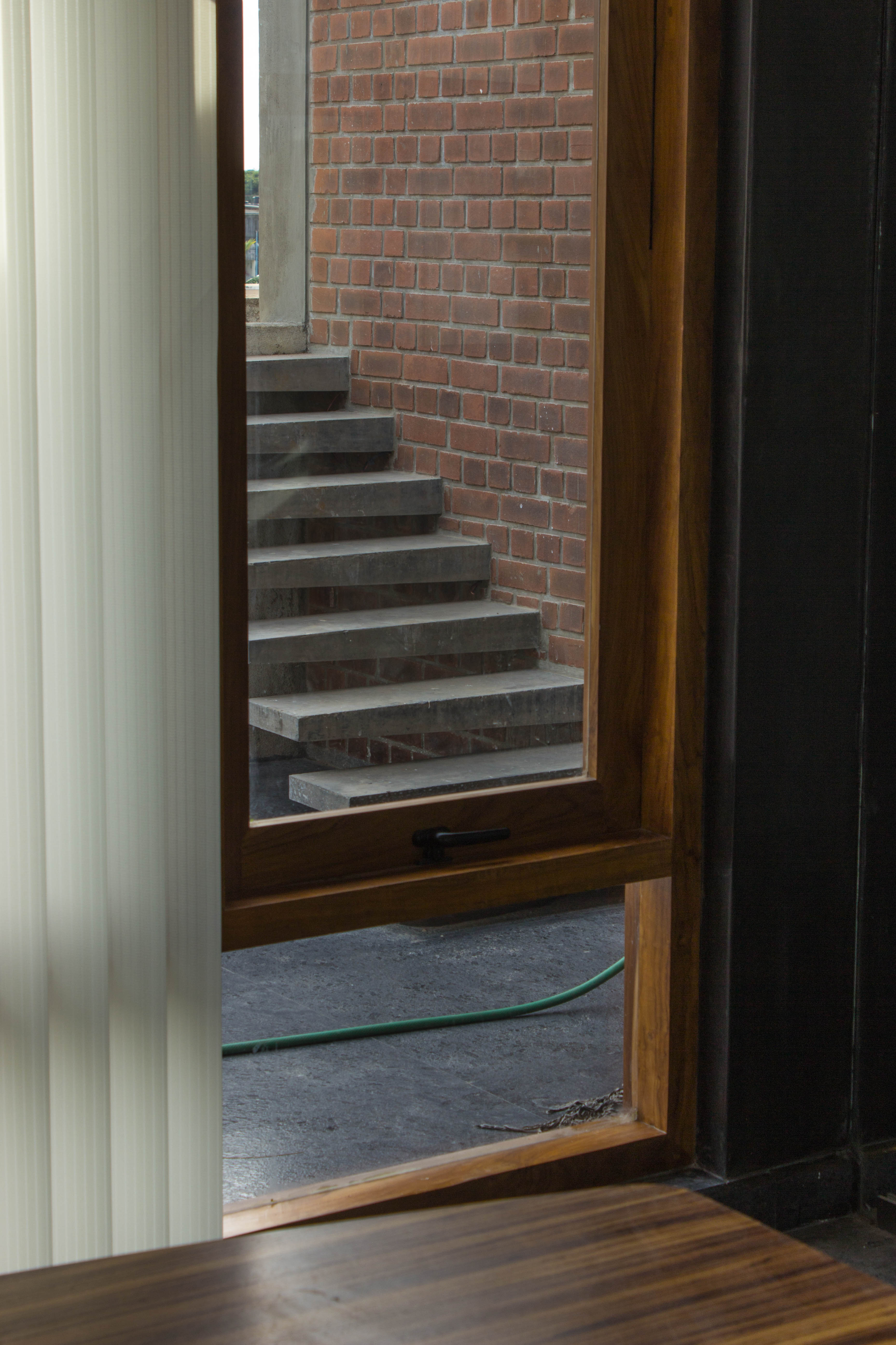We incorporated other elements such as ferrocement louvres, cantilevered steps and exposed brick walls. Exposed cement finishes and exposed brick walls, as rustic as they seem, could lend an air of brutality or detachment to a living space and what better way to calm the senses than a lush garden. A green carpet of grass surrounds the apartment as part of a zen garden and the enormous glass sliding doors on all the walls of the living room effortlessly draw the landscape indoors